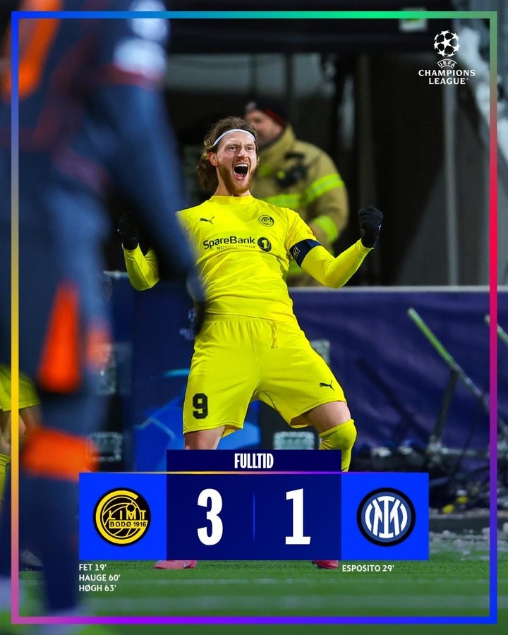 昨日,挪威北部小城博德,阿斯普米拉体育场的气温定格在零下8摄氏度。天气的极寒,很难让人将这里与欧冠赛事联系在一起。然而,正是在这样条件下,7889名挥舞着巨型黄色牙刷的球迷,见证了他们心爱的球队3-1击败国际米兰。这是他们本赛季的又一个奇迹之夜。